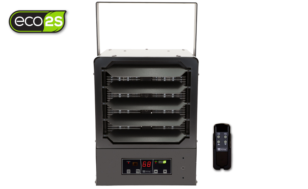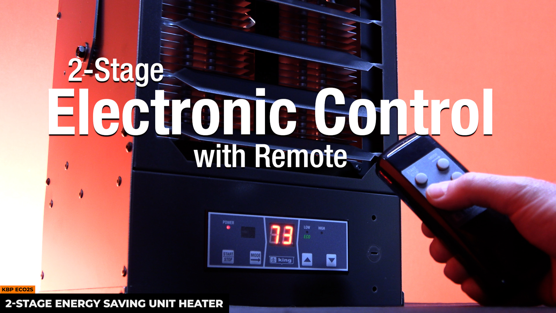 The KBP ECO2S series compact unit heater delivers exceptional performance, energy efficiency, and user control, featuring King’s innovative built-in ECO2S electronic thermostat with remote control. The heaters provide energy-efficient 2-stage heating, an Eco mode that automatically uses the lowest wattage needed, integrated fan-only and timer modes, and a convenient remote for simple operation.