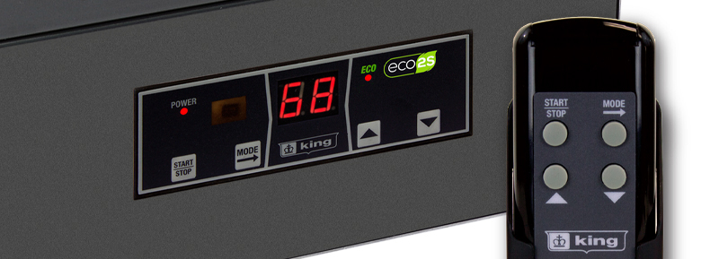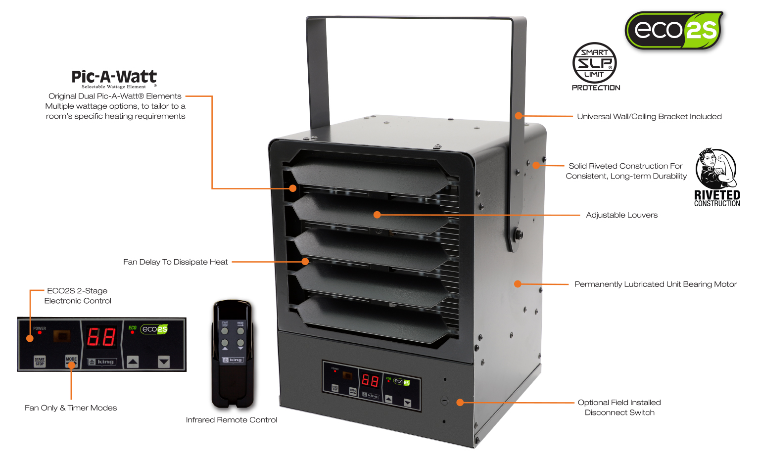 KBP ECO2S Works Smarter Not Harder by delivering exceptional performance, energy efficiency, and user control, featuring King’s innovative built-in ECO2S electronic thermostat with remote control. The heaters provide energy-efficient 2-stage heating, an Eco mode that automatically uses the lowest wattage needed, integrated fan-only and timer modes, and a convenient remote for simple operation.