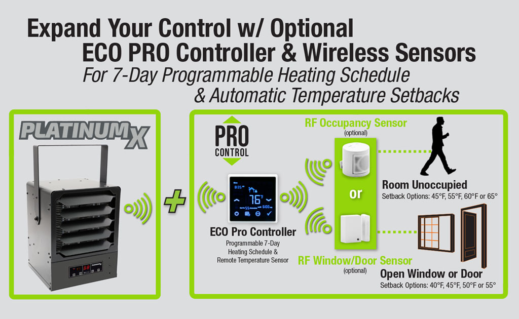 Compatible with both optional wired or wireless window/door and occupancy sensors, reducing energy waste by setting back the temperature when a space is unoccupied or when a window or door is left open. Multiple heaters can also be paired to a single ECO PRO Controller, creating smart heating zones within a space for optimal comfort and control.