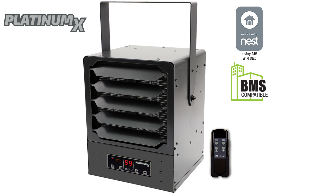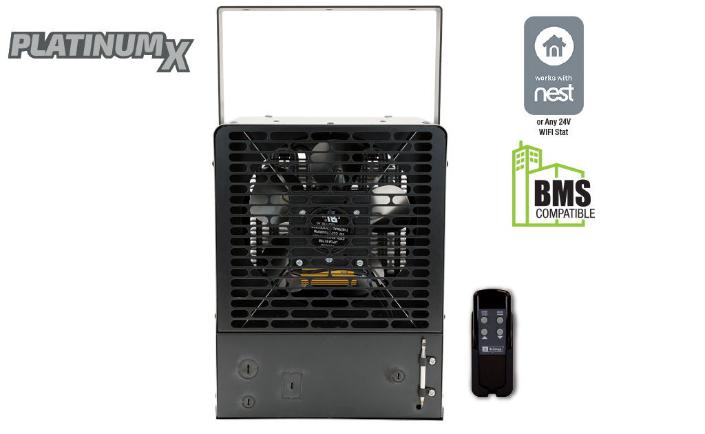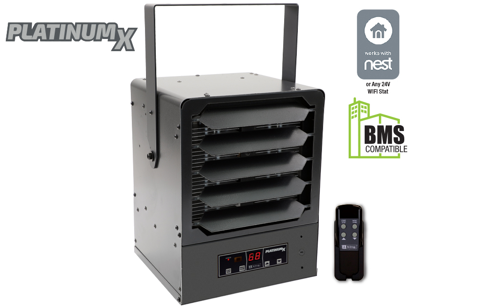 King’s KBP PlatinumX BMS series unit heaters are the most full-featured unit heaters on the market, with in-built electronic thermostat for +/- 1°F accuracy and remote control for simple operation. Comes standard with a provision for adding an optional 24V thermostat for remote temperature control, making it compatible with Nest Thermostats or Building Management System Integration. Combined with summer fan-only and thermostat timer modes, the KBP PlatinumX adapts to your needs year-round.